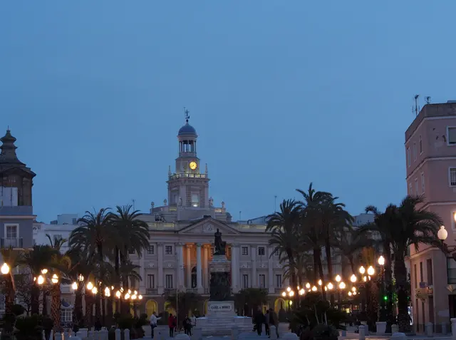 We bewonderen Puerta de Tierra en de resten van de stadsmuur om vervolgens naar Plaza de San Juan de Dios te wandelen. Hier is ook de VVV gevestigd. Het plein had door de nabijheid van de haven altijd een belangrijke sociale functie met bijvoorbeeld de stadsmarkt, het neoklassieke stadhuis en de San Juan de Dios kerk. Het Romeinse amfitheater bereiken we via C/Felix Soto. Aan de Avenida Campo Sur liggen ook de Santa Cruz kerk en de barokke kathedraal met goudkleurige koepel. De indrukwekkende, geel beige gevel wordt geflankeerd door twee klokkentorens met koepeltjes en zuilen. Van binnen is de kathedraal verrassend licht en ruim.